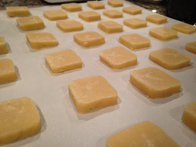 The recipe said to leave the two rolls in the fridge overnight, but that would imply I have some amount of patience. (I swear I can hear my mother laughing 3000 miles away...) It seemed that 3-4 hours was plenty. So after a few House of Cards episodes, I cut the very solid dough into 1/4 inch thick squares.